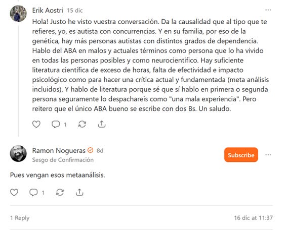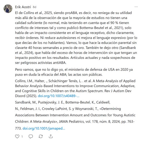 Si defiendes la que es, supuestamente, la única intervención para autistas basada en la evidencia, eres tú quien tiene que aportar dichas evidencias. Esto es ciencia, no vale solo con repetir el eslogan de «basado en la evidencia». Cada día me encuentro con apologistas del ABA y sus supuestas evidencias que no aportan más que experiencias personales de terceros, justo el tipo de evidencia que desestiman sistemáticamente cuando son personas autistas las que hablan en primera persona. Solo en ese caso es activismo.
