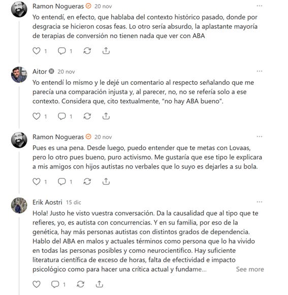 Desde el punto de vista de la honestidad intelectual, me cuesta muchísimo no hacer un paralelismo entre las terapias de conversión y el ABA, y no reclamar la misma crítica para una que para otra. En ambos casos se parte de la premisa de que existe una forma correcta de ser, sentir o comportarse, y de que cualquier desviación respecto a esa norma debe corregirse mediante una intervención sistemática —por tanto, no es neutra—. Asimismo, me cuesta entender a los psicólogos que promueven la ciencia y el progreso, pero no se detienen ni medio minuto a ver lo que hay realmente detrás del ABA.